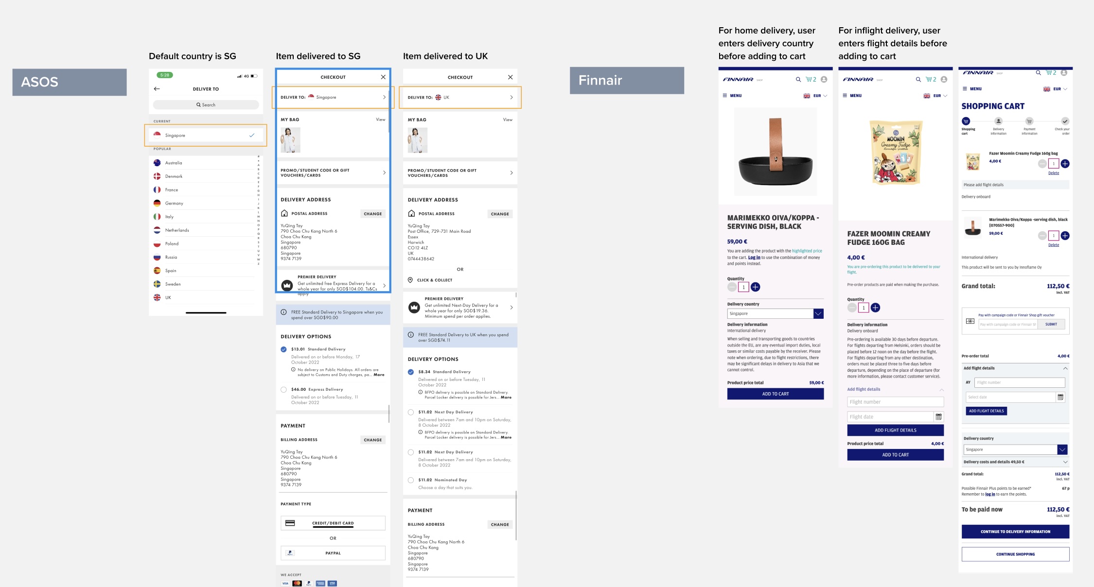 I conducted a benchmarking of international delivery features on similar e-commerce platforms such as ASOS and Finnair. I evaluated their add to cart flow and checkout process to identify best practices and areas for improvement.